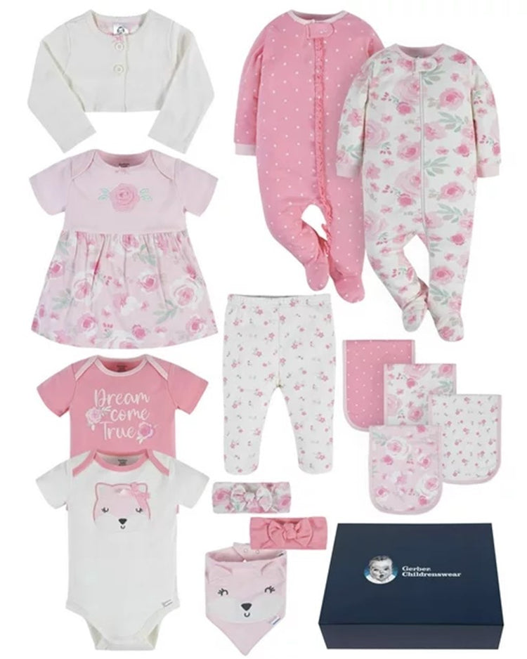 - Includes one dress, two Onesies Brand bodysuits, one pair of leggings, one jacket, two headbands, one bandana bib, two Sleep 'n Plays, & four burpcloths