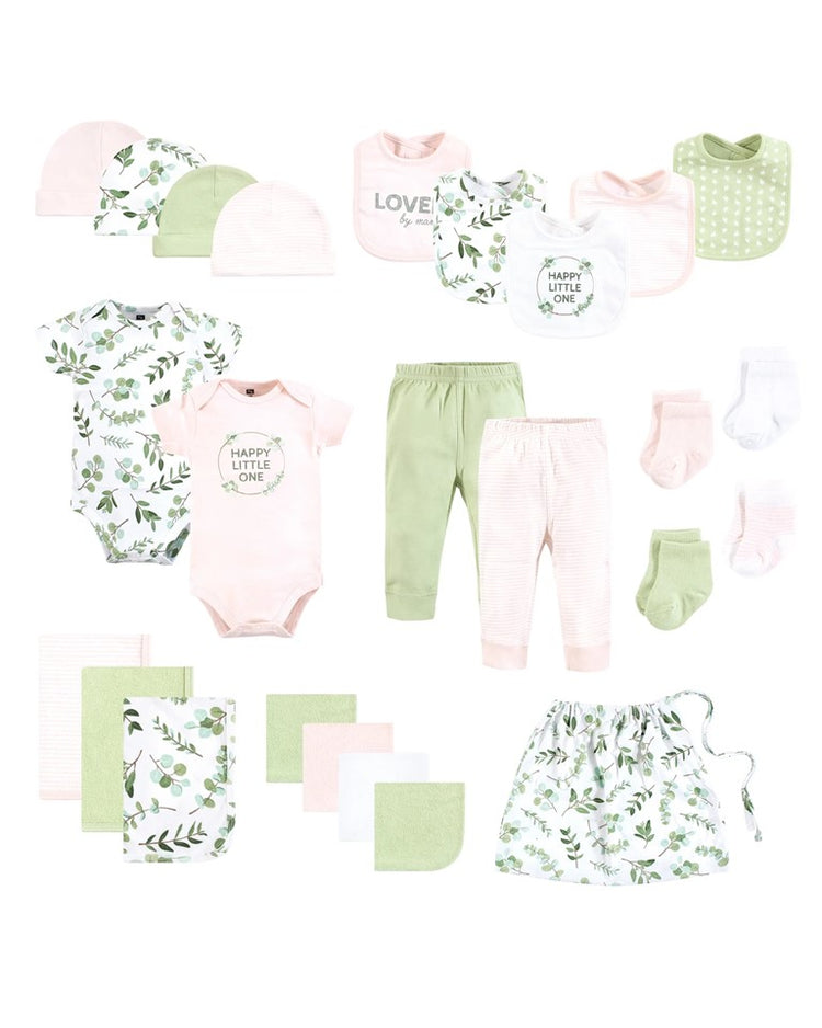 - Includes 2 bodysuits, 2 pull-on pants, 4 caps, 5 terry bibs, 4 pairs of socks, 3 burp cloths, 4 washcloths, 1 drawstring laundry bag