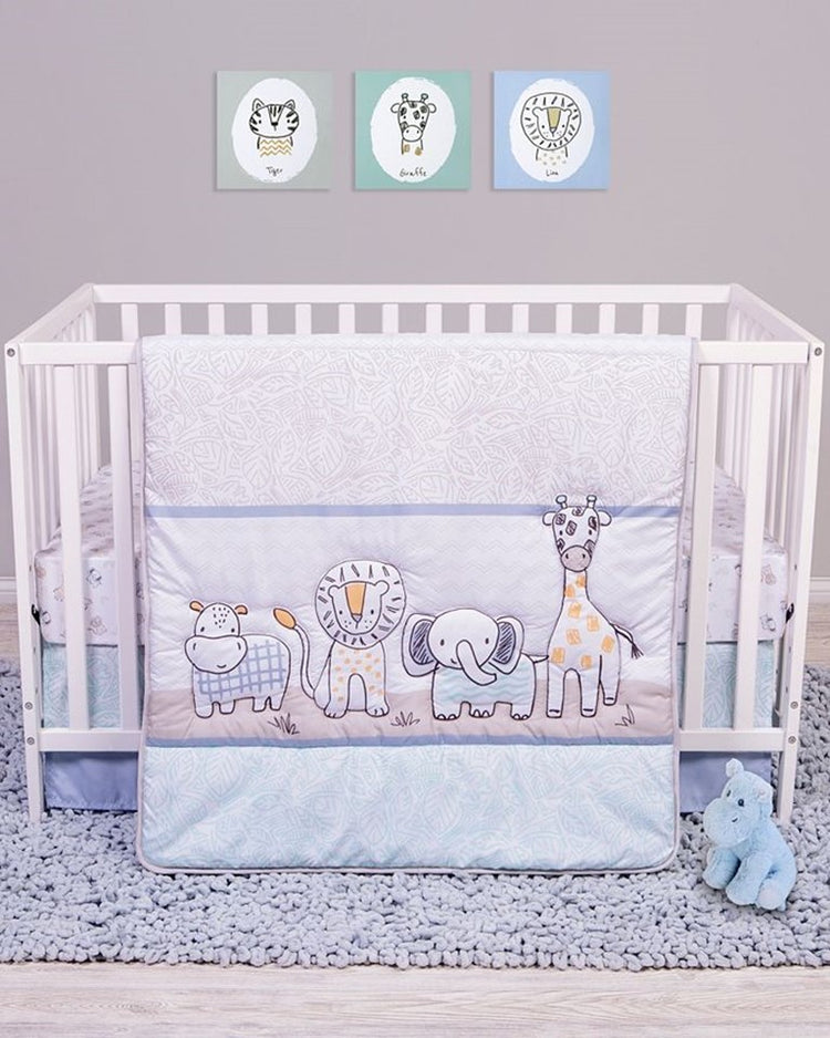 - Includes: Fitted Crib Sheet, Quilt, Crib Skirt, and Plush Toy