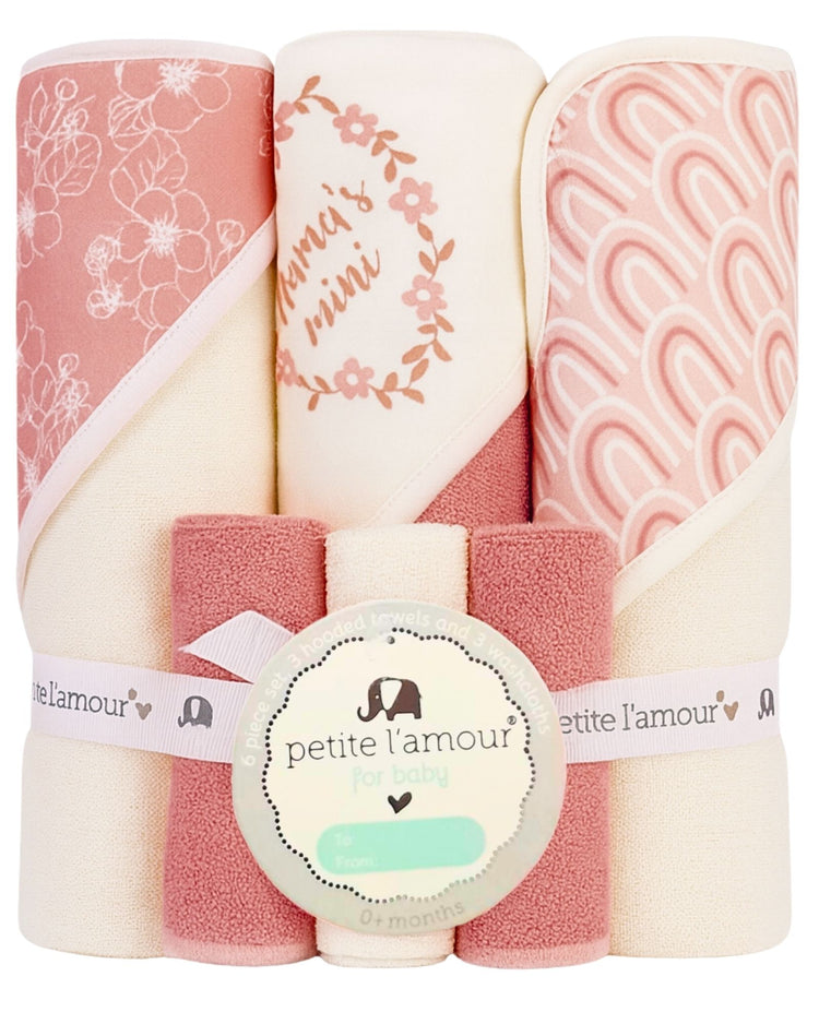 - Includes three hooded bath towels and three washcloths