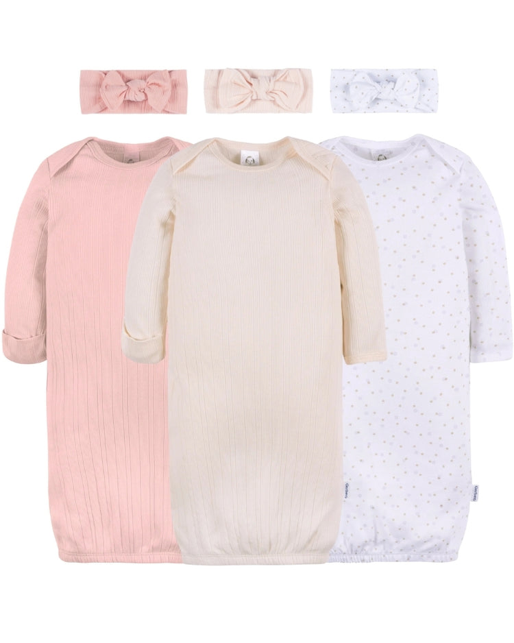 - Set Includes: 3 receiving gowns and 3 matching headbands.