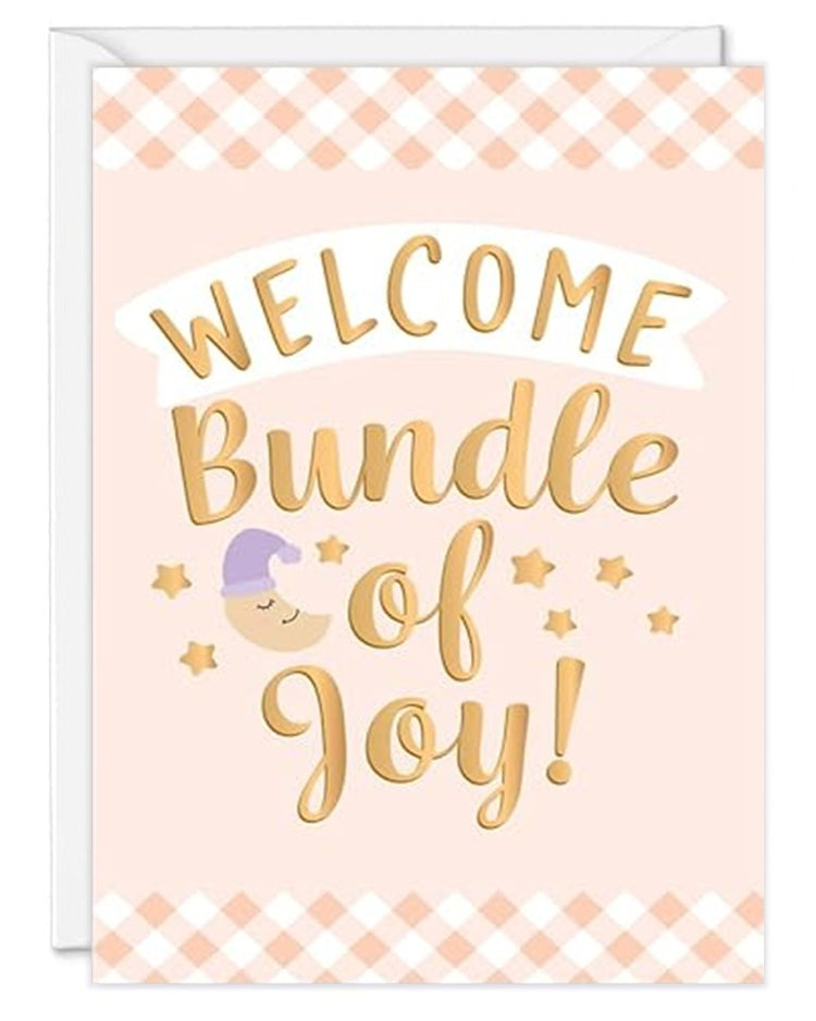 - Elegant gold foil design with cute front lettering "Welcome Bundle of Joy!"