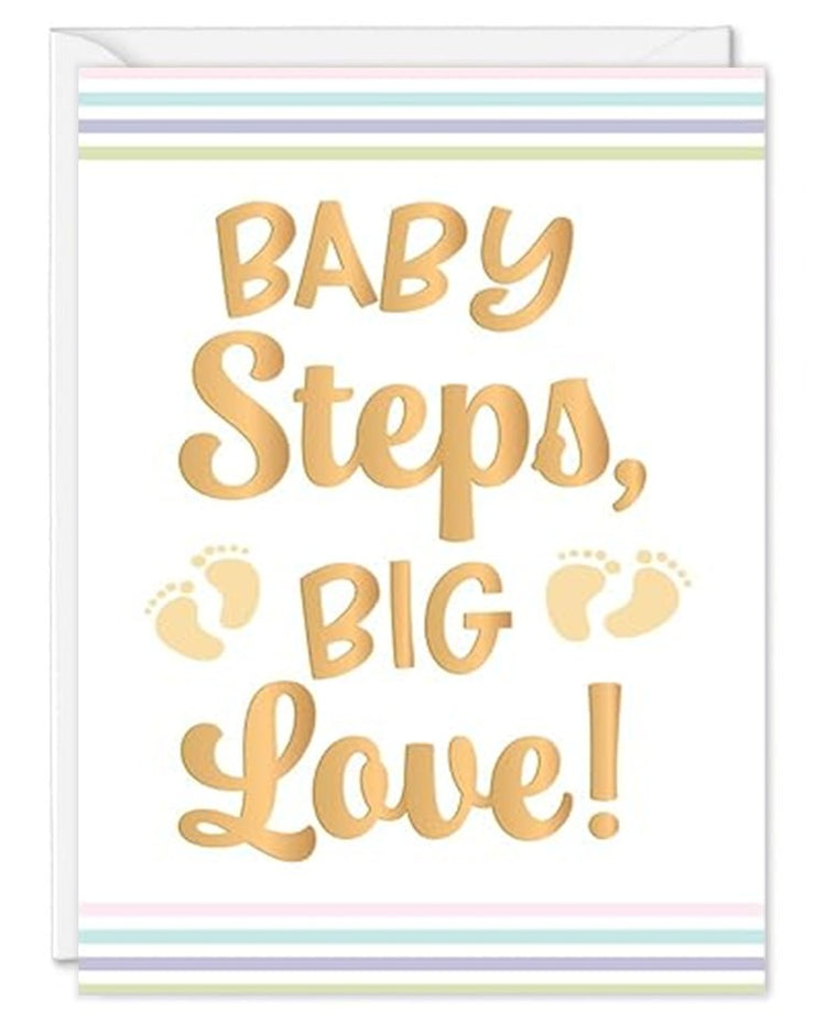 - Elegant gold foil design with cute front lettering "Baby Steps Big Love!"
