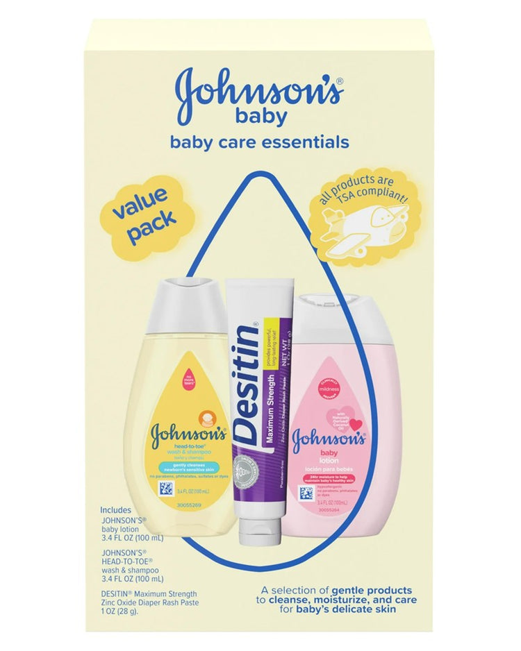 - Includes TSA compliant travel size Johnson's Head-To-Toe Baby Body Wash & Shampoo to care for baby's skin & delicate hair and Johnson's Mild Baby Moisturizing Lotion with coconut oil hydrates & nourishes delicate skin; and Desitin Maximum Strength Diaper Rash Paste to treat & help prevent baby diaper rash discomfort